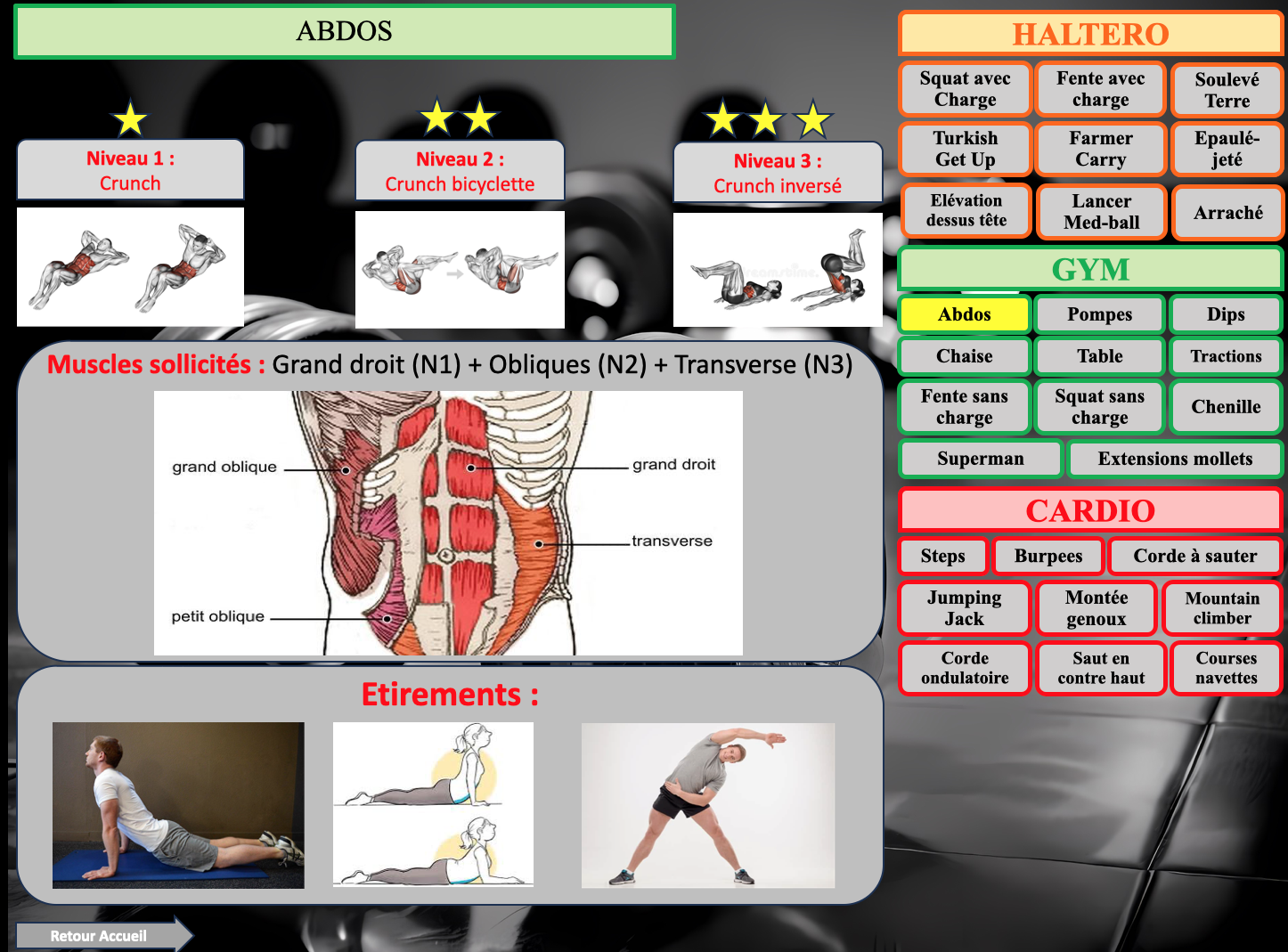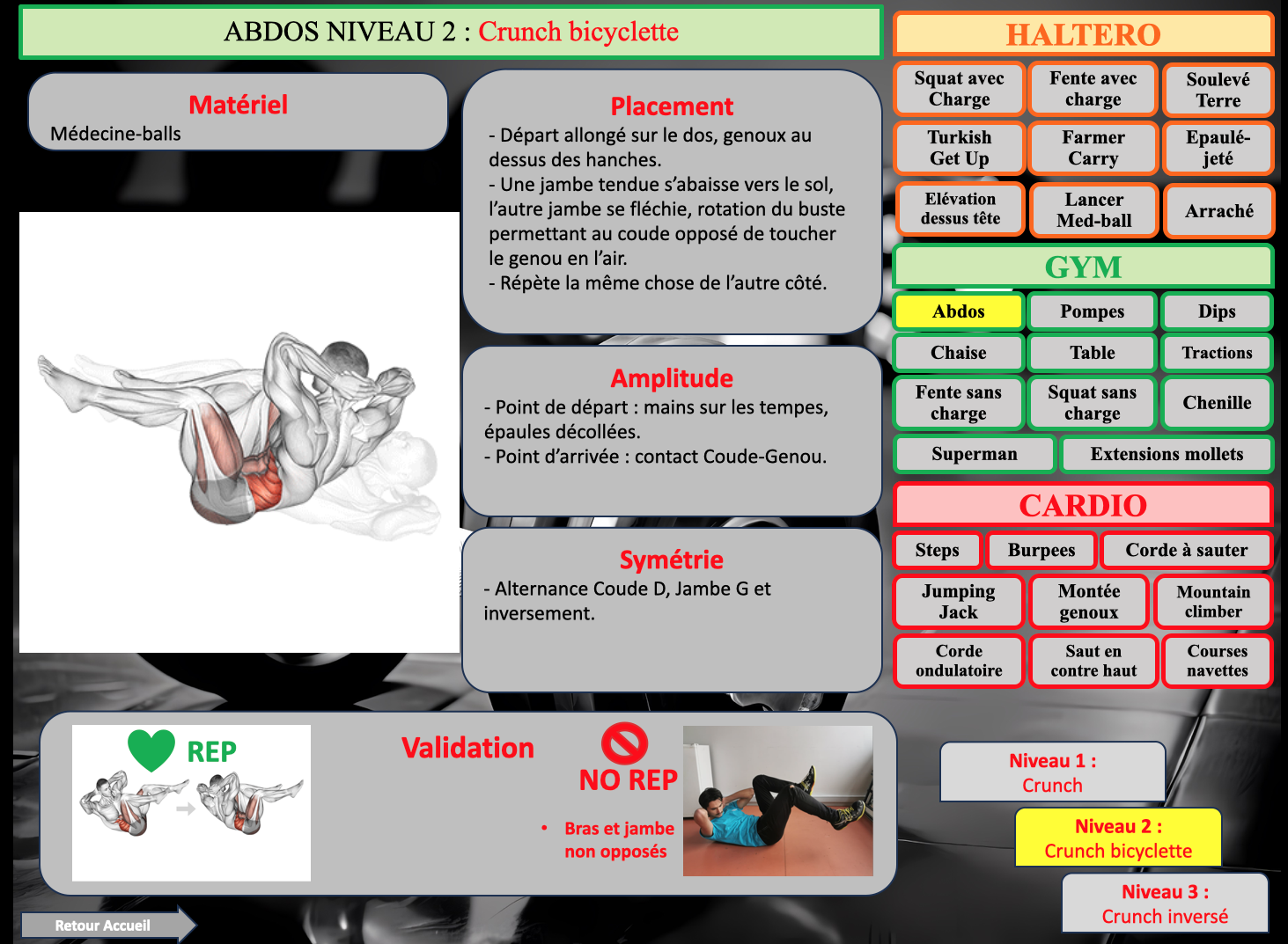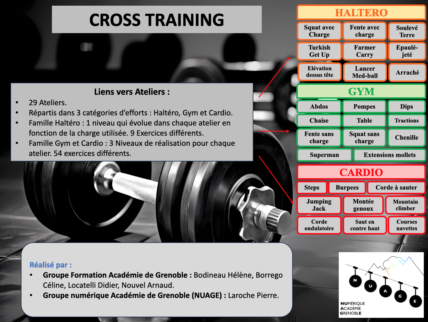 Ce diaporama, complément de la formation Cross Training, recense l'ensemble des ateliers avec les différents niveaux de pratique en vidéos ou gifs animés.